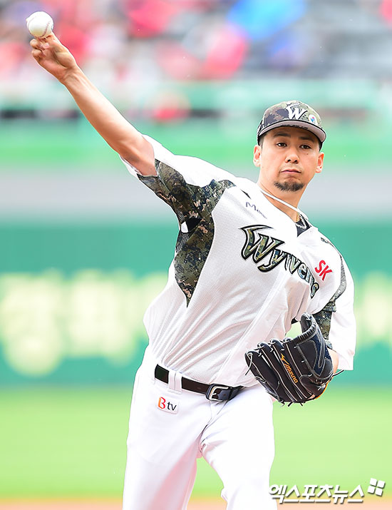 [엑스포츠뉴스 인천, 김한준 기자] 6일 오후 인천SK행복드림구장에서 열린 '2017 타이어뱅크 KBO리그' 넥센 히어로즈와 SK 와이번스의 경기, 1회초 SK 선발투수 윤희상이 공을 힘차게 던지고 있다.