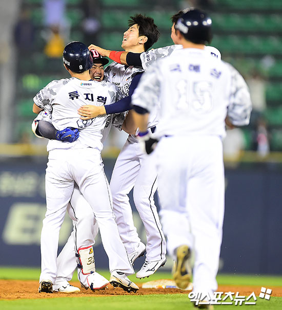 [엑스포츠뉴스 김한준 기자] 8일 오후 서울 송파구 잠실야구장에서 열린 '2017 타이어뱅크 KBO리그' 삼성 라이온즈와 두산 베어스의 경기, 두산이 연장 10회말 2사 1,3루 김재환의 끝내기 안타에 힘입어 삼성에 4:3 승리를 거뒀다.