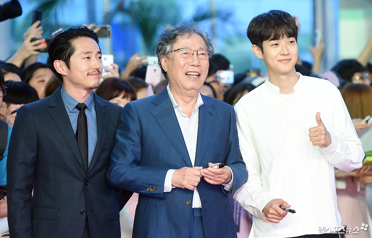 [엑스포츠뉴스 박지영 기자] 13일 오후 서울 영등포구 타임스퀘어에서 열린 영화 '옥자' 내한 레드카펫 행사에 참석한 스티븐 연, 변희봉, 최우식이 포토타임을 갖고 있다.