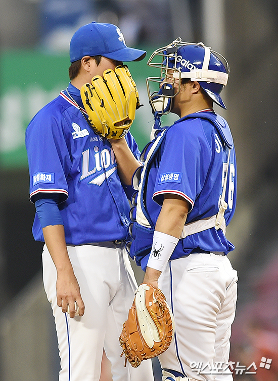 [엑스포츠뉴스 박지영 기자] 20일 오후 서울 송파구 잠실야구장에서 열린 '2017 타이어뱅크 KBO리그' 삼성 라이온즈와 LG 트윈스의 경기, 4회말 무사 1,2루 삼성 선발투수 우규민이 마운드에서 이지영과 이야기를 나누고 있다.