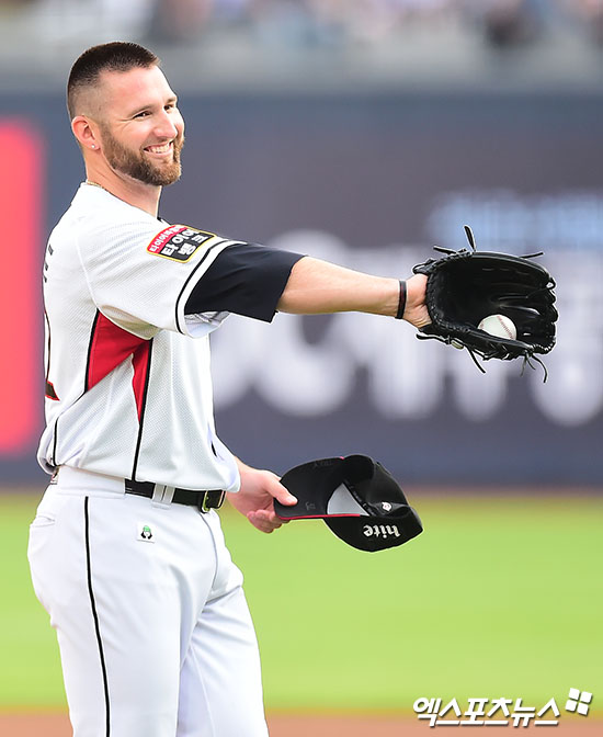 [엑스포츠뉴스 수원, 김한준 기자] 21일 오후 경기도 수원시 장안구 수원kt위즈파크에서 열린 '2017 타이어뱅크 KBO리그' 롯데 자이언츠와 kt 위즈의 경기, 1회초 kt 선발투수 피어밴드가 투구 전 미소를 보이고 있다.
