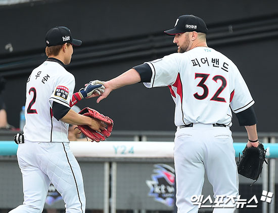 [엑스포츠뉴스 수원, 김한준 기자] 21일 오후 경기도 수원시 장안구 수원kt위즈파크에서 열린 '2017 타이어뱅크 KBO리그' 롯데 자이언츠와 kt 위즈의 경기, 1회초 수비를 마친 kt 선발투수 피어밴드가 심우준과 하이파이브를 하고 있다.