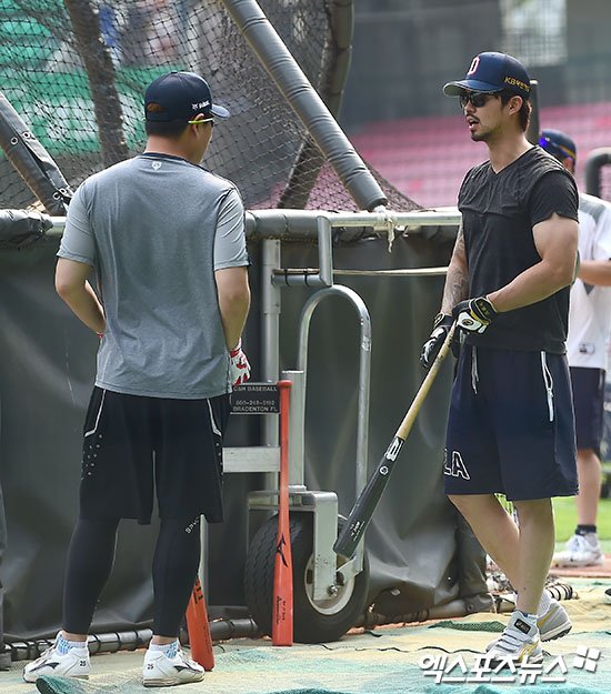 [엑스포츠뉴스 김한준 기자] 23일 오후 서울 송파구 잠실야구장에서 열리는 '2017 타이어뱅크 KBO리그' 롯데 자이언츠와 두산 베어스의 경기, 두산 양의지와 오재원이 대화를 나누고 있다.