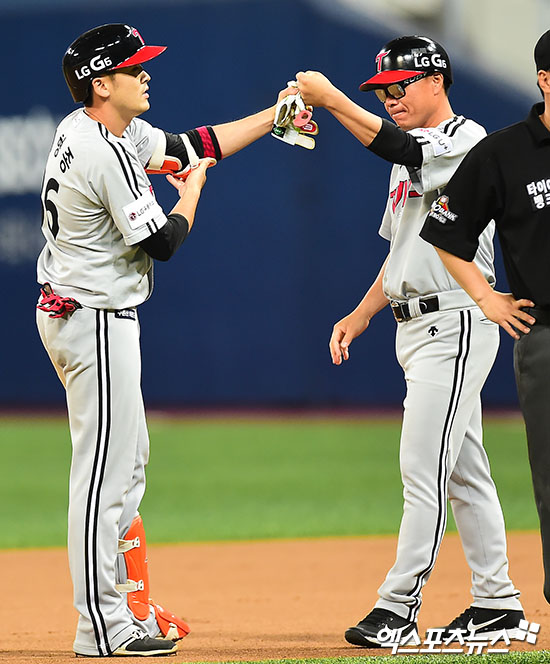 [엑스포츠뉴스 김한준 기자] 24일 오후 서울 구로구 고척스카이돔에서 열린 '2017 타이어뱅크 KBO리그' LG 트윈스와 넥센 히어로즈의 경기, 6회초 2사 1,3루 LG 이형종이 2타점 2루타를 날린 후 한혁수 코치와 하이파이브를 하고 있다.