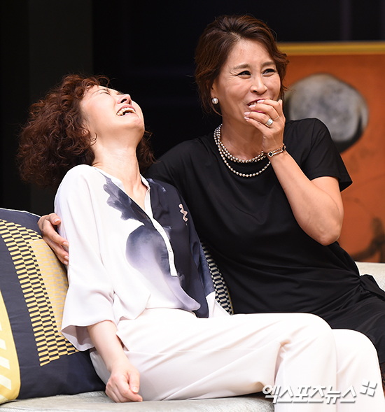 [엑스포츠뉴스 박지영 기자] 27일 오후 서울 서초구 예술의전당 자유소극장에서 열린 연극 '대학살의 신' 프레스콜에 참석한 배우 이지하와 최정원이 연기 중 웃음을 터뜨리고 있다.