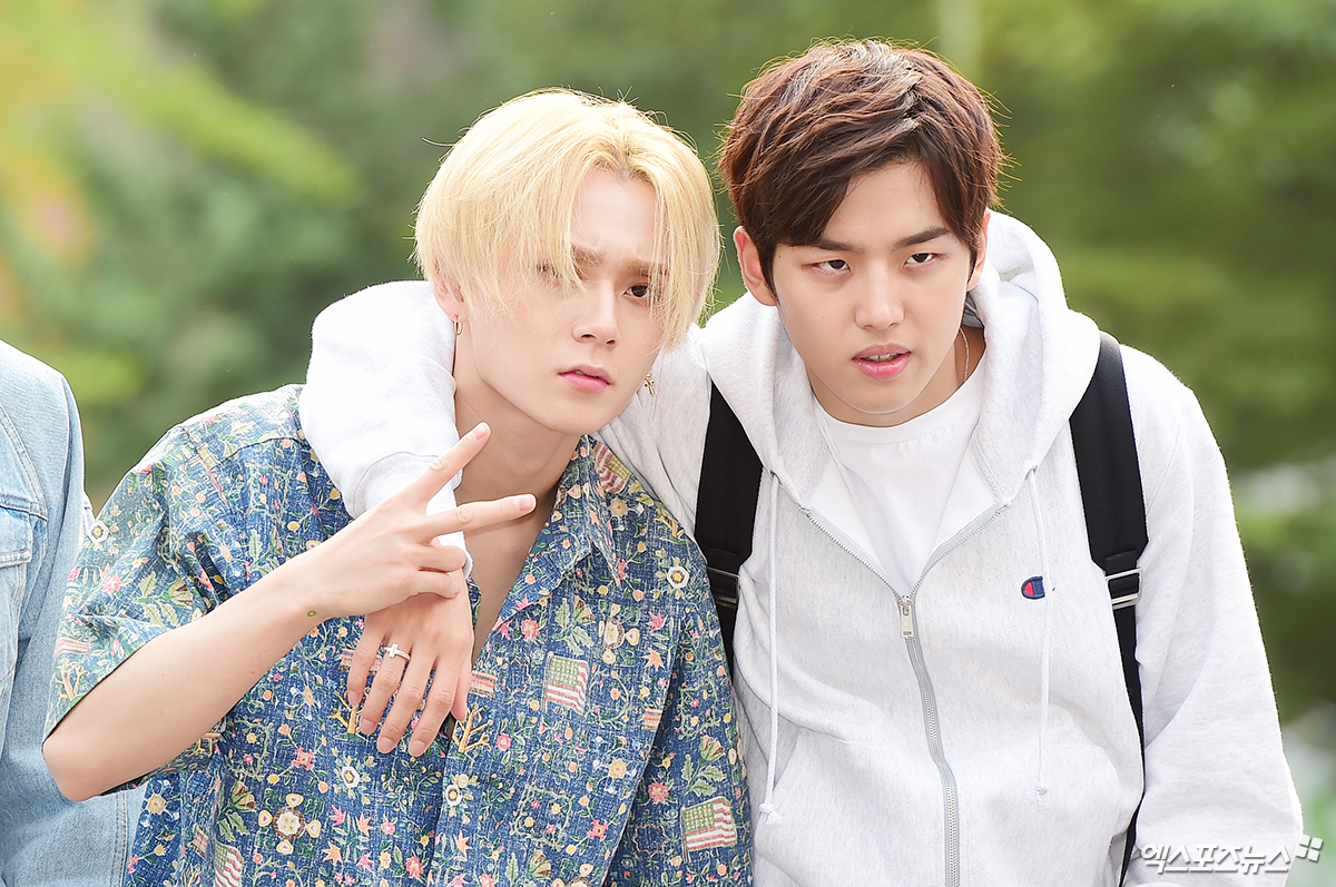[엑스포츠뉴스 박지영 기자] 30일 오전 서울 여의도동 KBS신관에서 열린 KBS2 '뮤직뱅크' 리허설에 참석한 펜타곤 이던과 홍석이 출근길에 포토타임을 갖고 있다.