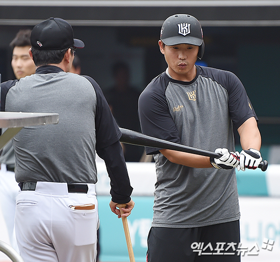 [엑스포츠뉴스 수원, 박지영 기자] 1일 오후 경기도 수원시 장안구 수원kt위즈파크에서 열린 '2017 타이어뱅크 KBO리그' 넥센 히어로즈와 kt 위즈의 경기에 앞서 kt 박경수가 타격 훈련 중 코칭스탭과 이야기를 나누고 있다.