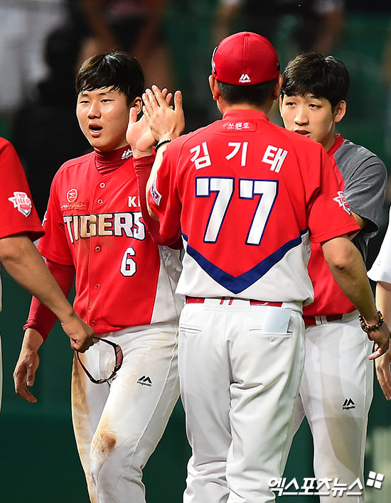 이날 경기에서 승리한 KIA 최원준이 김기태 감독과 하이파이브를 하고 있다.