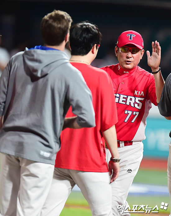 이날 경기에서 승리한 KIA 김기태 감독이 양현종과 하이파이브를 하고 있다.