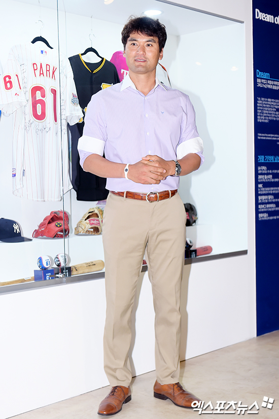 [엑스포츠뉴스 서예진 기자] 10일 오전 서울 을지로1가 그레뱅 뮤지업에서 진행된 ‘그레뱅 스타탐구전 – 박찬호’ 전시 오픈식 및 포토 행사에 참석한 박찬호가 포즈를 취하고 있다.