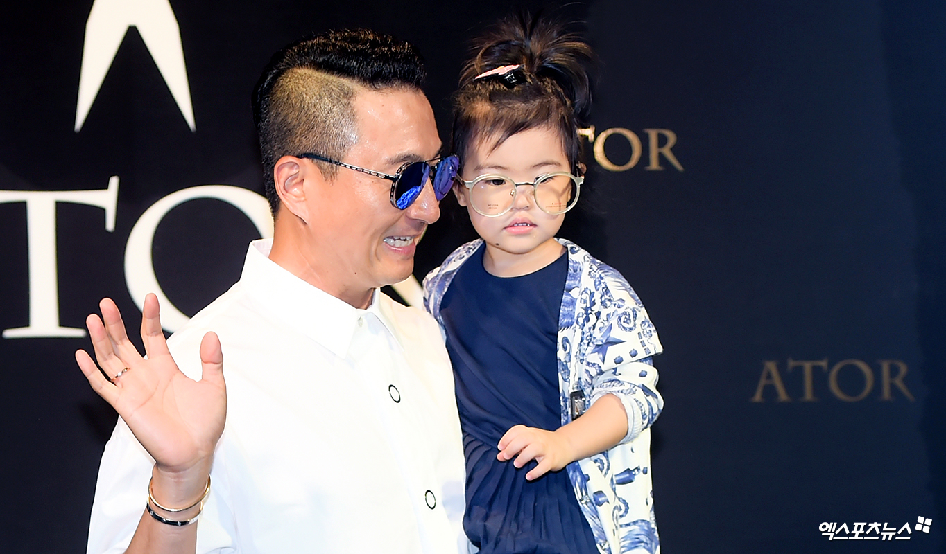[엑스포츠뉴스 서예진 기자] 10일 오후 서울 청담동의 한 패션 매장에서 진행된 론칭 행사에 참석한 가수 주영훈이 딸과 함께 포즈를 취하고 있다.