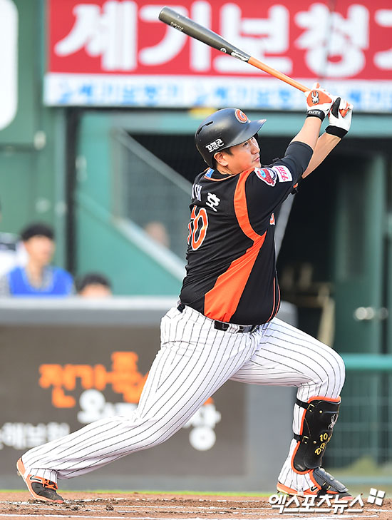 [엑스포츠뉴스 대전, 김한준 기자] 13일 오후 대전광역시 중구 한화생명 이글스파크에서 열린 '2017 타이어뱅크 KBO리그' 롯데 자이언츠와 한화 이글스의 경기, 1회초 2사 2루 롯데 이대호가 타격을 하고 있다. 결과는 우익수 플라이 아웃.