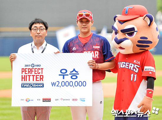 [엑스포츠뉴스 대구, 김한준 기자] 15일 오후 대구 삼성 라이온즈 파크에서 열린 '2017 타이어뱅크 KBO 올스타전' 나눔 올스타와 드림 올스타의 경기, 퍼펙트 히터에서 우승을 차지한 KIA 김윤동이 포즈를 취하고 있다.