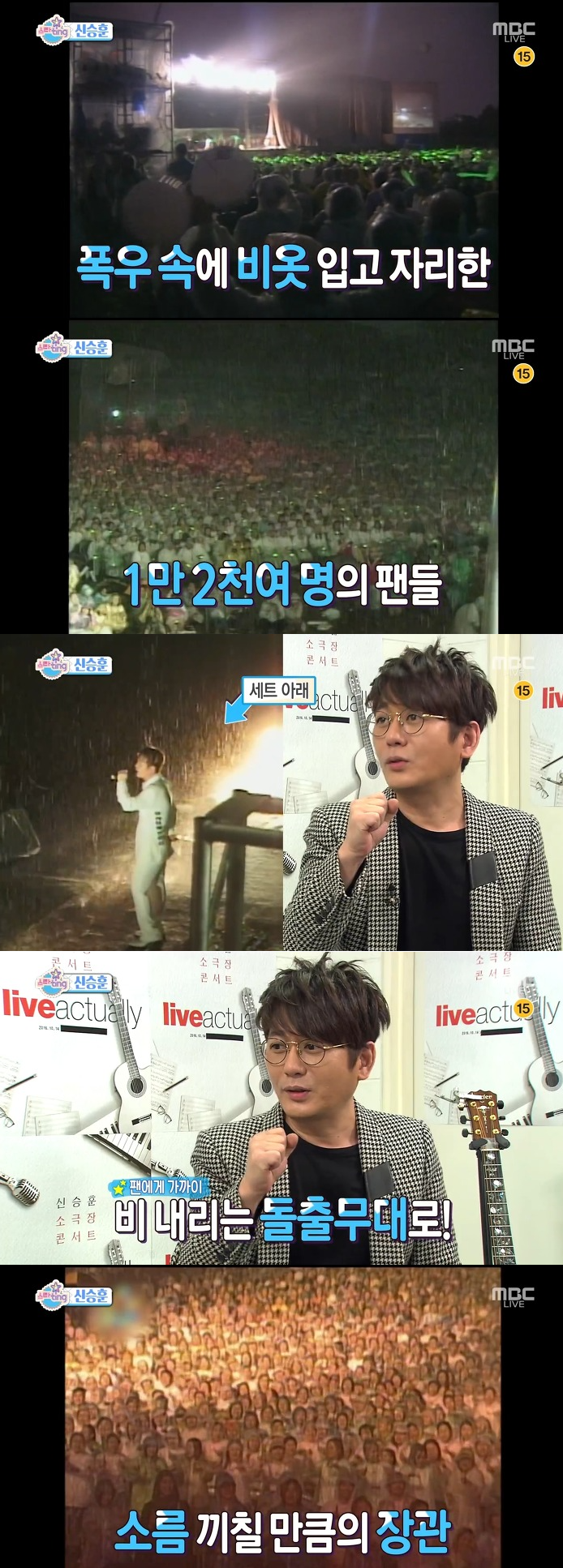 이어 신승훈은 “비가 쏟아지는 와중에 1만 2천여 명의 팬들이 우비를 쓰고 관람했다. 나는 비를 맞고 있지 않다가 (팬에게 가까이 가기 위해) 내가 비를 맞으려고 T자 무대로 나가니까 팬들이 들어가라고 하더라. 그래도 나가니까 팬들이 갑자기 쓰고 있던 우비 모자를 다 벗었다. 하얀 게 전부 까맣게 변했다. 그때 진짜 눈물이 났다"라고 당시를 회상했다.
