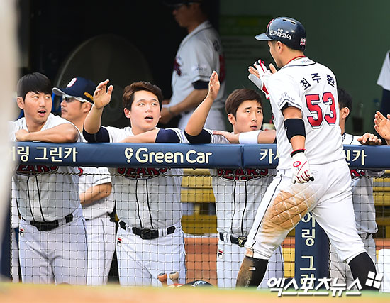 [엑스포츠뉴스 김한준 기자] 9일 오후 서울 송파구 잠실야구장에서 열린 '2017 타이어뱅크 KBO리그' 한화 이글스와 두산 베어스의 경기, 1회말 무사 1,2루 두산 최주환이 박건우의 1타점 적시타때 득점에 성공한 후 더그아웃에서 하이파이브를 하고 있다.