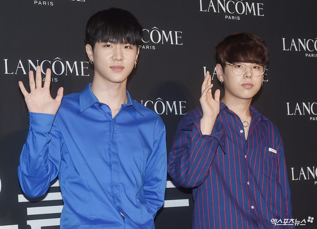 [엑스포츠뉴스 박지영 기자] 9일 오후 서울 논현동 플랫폼엘에서 열린 한 글로벌 뷰티 브랜드 신제품 출시 기념 '오늘부터1일 팝업 스토어' 오픈 행사에 참석한 프듀2 출신 김동한과 장대현이 포토타임을 갖고 있다.