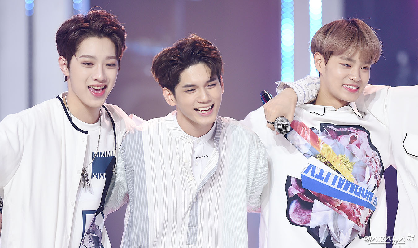 [엑스포츠뉴스 고양, 박지영 기자] 16일 오후 경기도 고양시 MBC드림센터에서 열린 MBC 뮤직 '쇼! 챔피언' 현장 공개 방송에 참석한 워너원 라이관린, 옹성우, 이대휘가 1위 수상 후 기쁨을 나누고 있다.