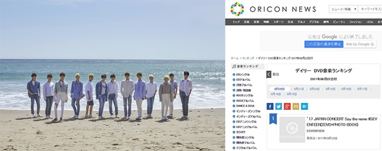 22일 오리콘 데일리 DVD 음악 랭킹 차트에서 1위를 차지한 세븐틴의 DVD는 지난 2월 개최되었던 ‘17 JAPAN CONCERT Say the name #SEVENTEEN’ 콘서트 현장을 담은 DVD로 지금까지도 그날의 뜨거운 열기를 내뿜고 있다. 지난 2월 개최된 일본 단독 콘서트는 세븐틴이 일본에서 정식 데뷔도 전에 진행했던 두 번째 일본 단독 콘서트로 약 7000석 규모의 고베 월드 기념 홀 아레나 공연장에서 4회, 약 1만 2000석 규모의 요코하마 아레나에서 2회를 진행하는 등 총 6회 공연을 전석 매진시키며 세븐틴의 뜨거운 인기를 증명해냈었다.