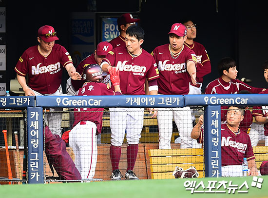 [엑스포츠뉴스 김한준 기자] 25일 오후 서울 송파구 잠실야구장에서 열린 '2017 타이어뱅크 KBO리그' 넥센 히어로즈와 두산 베어스의 경기, 1회초 2사 2루 넥센 이정후가 김하성의 1타점 2루타때 득점에 성공한 후 더그아웃에서 하이파이브를 하고 있다.