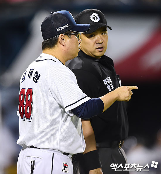 [엑스포츠뉴스 김한준 기자] 26일 오후 서울 송파구 잠실야구장에서 열린 '2017 타이어뱅크 KBO리그' LG 트윈스와 두산 베어스의 경기, 5회초 무사 2루 두산 김태형 감독이 2루 주자 LG 채은성의 태그업 플레이에 관해 윤태수 구심에게 어필하고 있다.