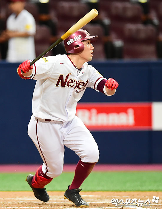 [엑스포츠뉴스 김한준 기자] 30일 오후 서울 구로구 고척스카이돔에서 열린 '2017 타이어뱅크 KBO리그' SK 와이번스와 넥센 히어로즈의 경기, 5회말 1사 넥센 서건창이 중전안타를 날리고 있다.