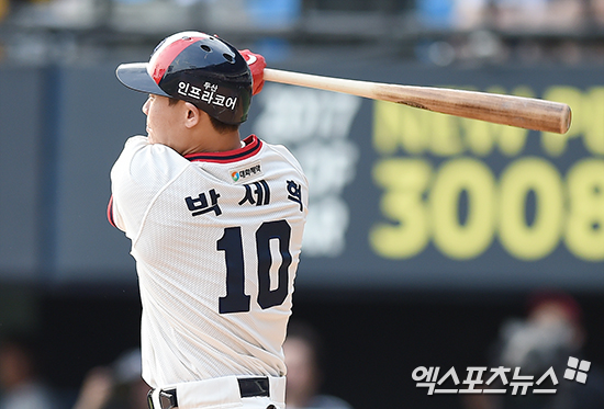 [엑스포츠뉴스 박지영 기자] 3일 오후 서울 송파구 잠실야구장에서 열린 '2017 타이어뱅크 KBO리그' 삼성 라이온즈와 두산 베어스의 경기, 6회말 무사 두산 박세혁이 2루타를 때려내고 있다.