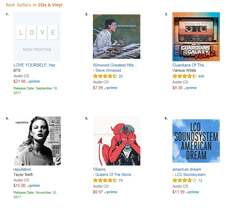 방탄소년단은 지난달 29일 오전 7시(한국시간)부터 미국 아마존에서 18일 발매 예정인 새 앨범 LOVE YOURSELF 承 'Her'의 예약 판매를 실시했다. 이 가운데 3시간 만에 CDs & Vinyl 부문 베스트 셀러 1위를 기록했으며, 현재까지 계속 정상을 유지 중이다.