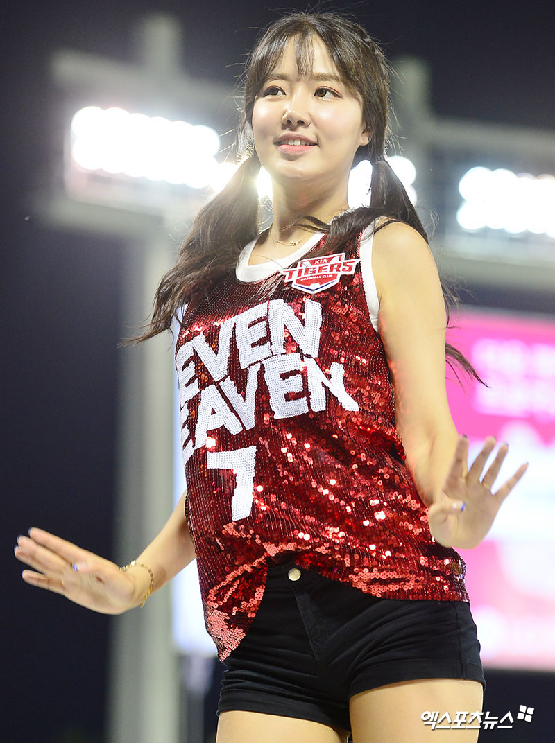 [엑스포츠뉴스 김한준 기자] 5일 오후 서울 송파구 잠실야구장에서 '2017 타이어뱅크 KBO리그' KIA 타이거즈와 LG 트윈스의 경기, KIA 치어리더 김맑음이 멋진 공연을 선보이고 있다.