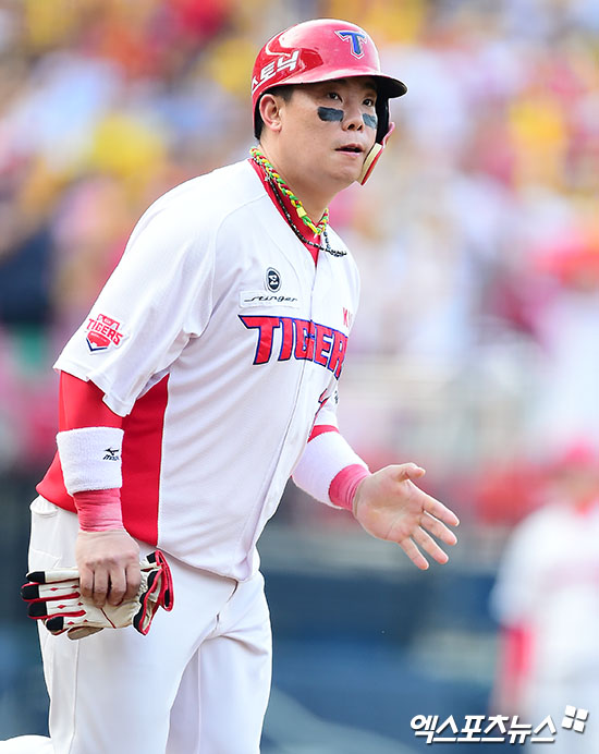 [엑스포츠뉴스 광주, 김한준 기자] 9일 오후 광주-기아 챔피언스필드에서 열린 '2017 타이어뱅크 KBO리그' 삼성 라이온즈와 KIA 타이거즈의 경기, 1회말 2사 KIA 나지완이 사구로 출루하고 있다.