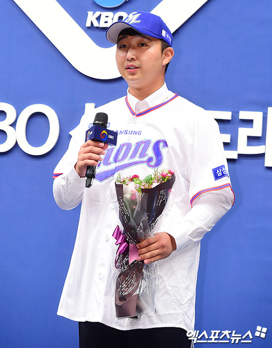 [엑스포츠뉴스 김한준 기자] 11일 오후 서울 소공동 서울웨스틴조선호텔 그랜드볼룸에서 열린 '2018 KBO 신인 드래프트'에서 삼성에 1차 지명된 최채흥이 소감을 말하고 있다.