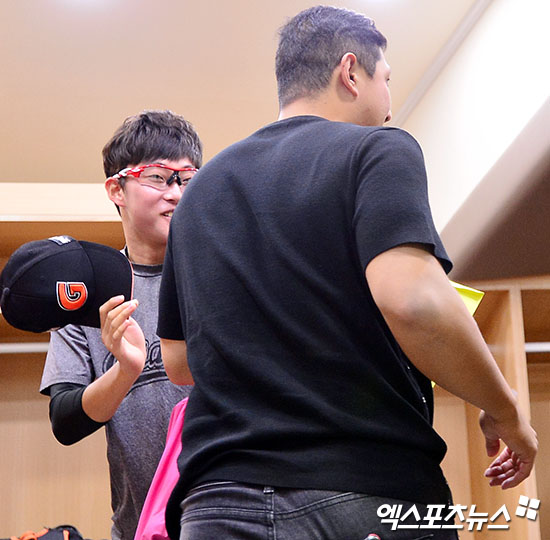 박세웅 '(황)재균이형이 왜 락커룸에?'[포토]