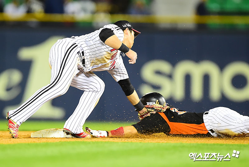 [엑스포츠뉴스 김한준 기자] 12일 오후 서울 송파구 잠실야구장에서 열린 '2017 타이어뱅크 KBO리그' 롯데 자이언츠와 LG 트윈스의 경기, 8회초 무사 1루 롯데 손아섭이 2루 도루를 시도하다 LG 오지환에게 태그 아웃을 당하고 있다.