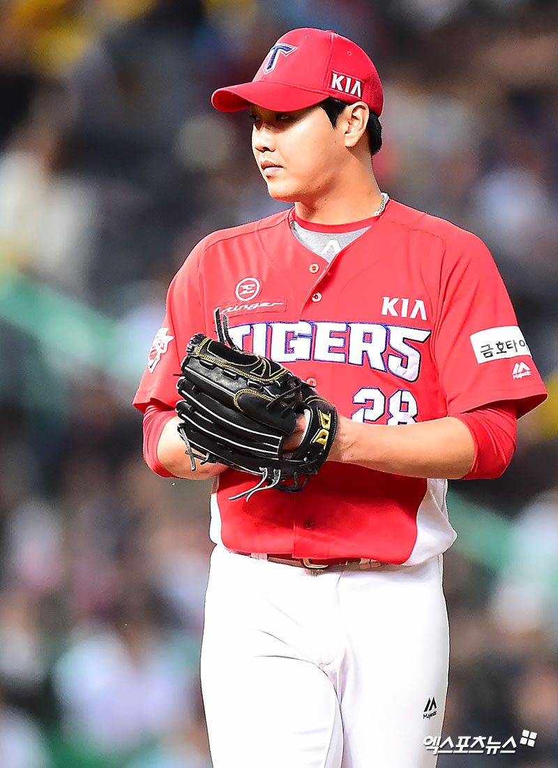 [엑스포츠뉴스 인천, 김한준 기자] 13일 오후 인천SK행복드림구장에서 열린 '2017 타이어뱅크 KBO리그' KIA 타이거즈와 SK 와이번스의 경기, 7회말 무사 1루 KIA 김윤동이 SK 정의윤에게 우전안타를 허용한 후 아쉬워하고 있다.