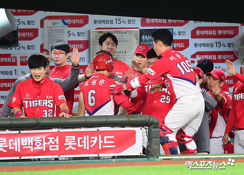 [엑스포츠뉴스 부산, 김한준 기자] 14일 오후 부산 동래구 사직야구장에서 열린 '2017 타이어뱅크 KBO리그' KIA 타이거즈와 롯데 자이언츠의 경기, 1회초 무사 2루 KIA 최원준이 김선빈의 1타점 적시타때 득점에 성공한 후 더그아웃에서 하이파이브를 하고 있다.