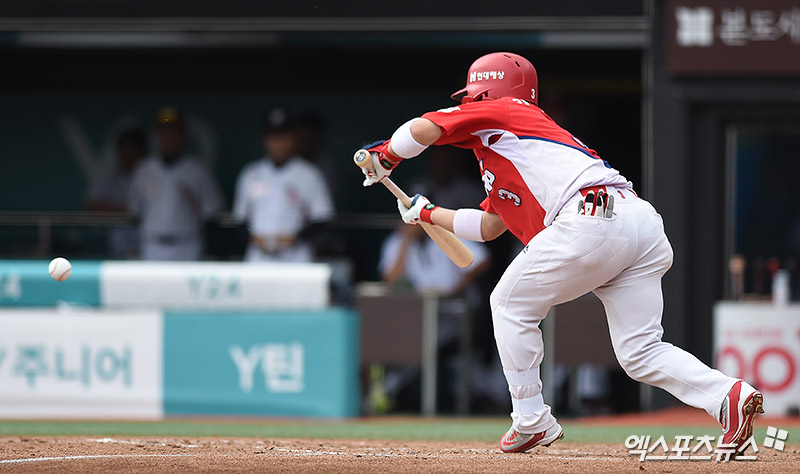[엑스포츠뉴스 수원, 박지영 기자] 3일 오후 경기도 수원시 장안구 수원kt위즈파크에서 열린 '2017 타이어뱅크 KBO리그' KIA 타이거즈와 kt 위즈의 경기, 3회초 무사 1루 KIA 김선빈이 번트를 시도하고 있다. 결과는 1루주자 김민식 2루 진루, 타자 김선빈 희생번트 아웃.