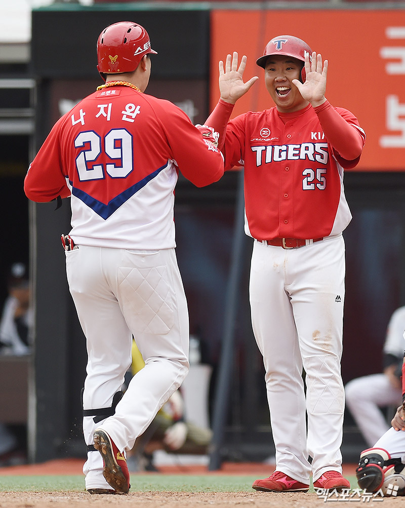 [엑스포츠뉴스 수원, 박지영 기자] 3일 오후 경기도 수원시 장안구 수원kt위즈파크에서 열린 '2017 타이어뱅크 KBO리그' KIA 타이거즈와 kt 위즈의 경기, 5회초 2사 1루 KIA 나지완이 2점홈런을 때려낸 뒤 1루주자 이범호와 홈을 밟으며 기쁨을 나누고 있다.