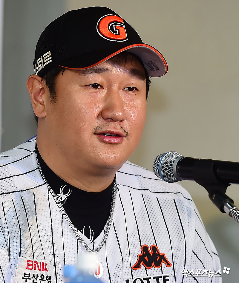 [엑스포츠뉴스 부산, 김한준 기자] 7일 오후 부산 동래구 사직야구장에서 열린 '2017 타이어뱅크 KBO리그 포스트시즌' 준플레이오프 미디어데이에 참석한 롯데 이대호가 취재진의 질문에 답하고 있다.
