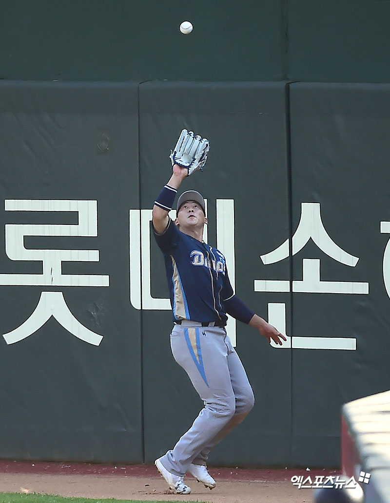 [엑스포츠뉴스 부산, 김한준 기자] 9일 오후 부산 동래구 사직야구장에 열린 '2017 타이어뱅크 KBO리그 포스트시즌' NC 다이노스와 롯데 자이언츠의 준플레이오프 2차전 경기, 4회말 2사 1,2루 NC 나성범이 롯데 전준우의 타구를 잡아내고 있다.
