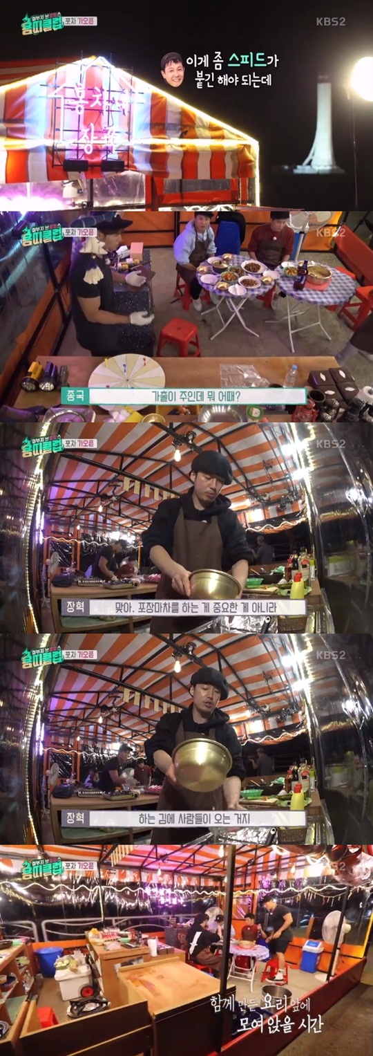 요리를 걱정하는 친구들의 모습에 김종국은 "포장 마차가 중요한 게 아니다. 우리가 가출을 했다는 게 중요하다"라고 말했다. 이어 장혁은 "그렇다. 포장 마차를 하는 게 중요한 게 아니라 하는 김에 사람들이 오는 거다"라고 격려를 했다.