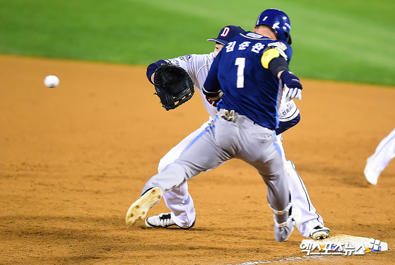 오재일-김준완 '공이 먼저냐 발이 먼저냐'[포토]