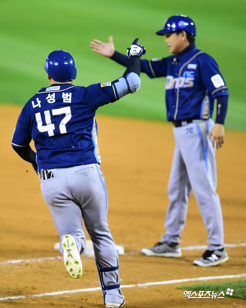 [엑스포츠뉴스 김한준 기자] 18일 오후 서울 송파구 잠실야구장에서 열린 '2017 타이어뱅크 KBO리그 포스트시즌' NC 다이노스와 두산 베어스의 플레이오프 2차전 경기, 5회초 무사 1루 NC 나성범이 투런 홈런을 날린 후 기뻐하고 있다.