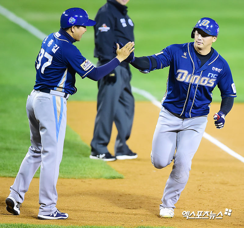 [엑스포츠뉴스 김한준 기자] 18일 오후 서울 송파구 잠실야구장에서 열린 '2017 타이어뱅크 KBO리그 포스트시즌' NC 다이노스와 두산 베어스의 플레이오프 2차전 경기, 5회초 무사 1루 NC 나성범이 투런 홈런을 날린 후 진종길 코치와 하이파이브를 하고 있다.