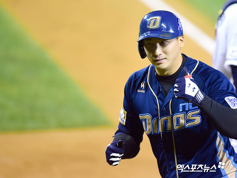 [엑스포츠뉴스 김한준 기자] 18일 오후 서울 송파구 잠실야구장에서 열린 '2017 타이어뱅크 KBO리그 포스트시즌' NC 다이노스와 두산 베어스의 플레이오프 2차전 경기, 5회초 무사 1루 NC 나성범이 투런 홈런을 날린 후 기뻐하고 있다.