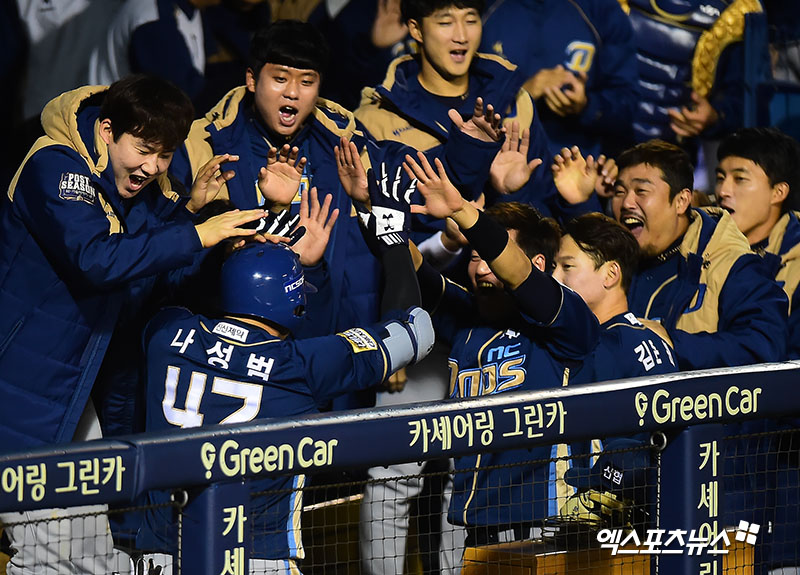 [엑스포츠뉴스 김한준 기자] 18일 오후 서울 송파구 잠실야구장에서 열린 '2017 타이어뱅크 KBO리그 포스트시즌' NC 다이노스와 두산 베어스의 플레이오프 2차전 경기, 5회초 무사 1루 NC 나성범이 투런 홈런을 날린 후 더그아웃에서 하이파이브를 하고 있다.