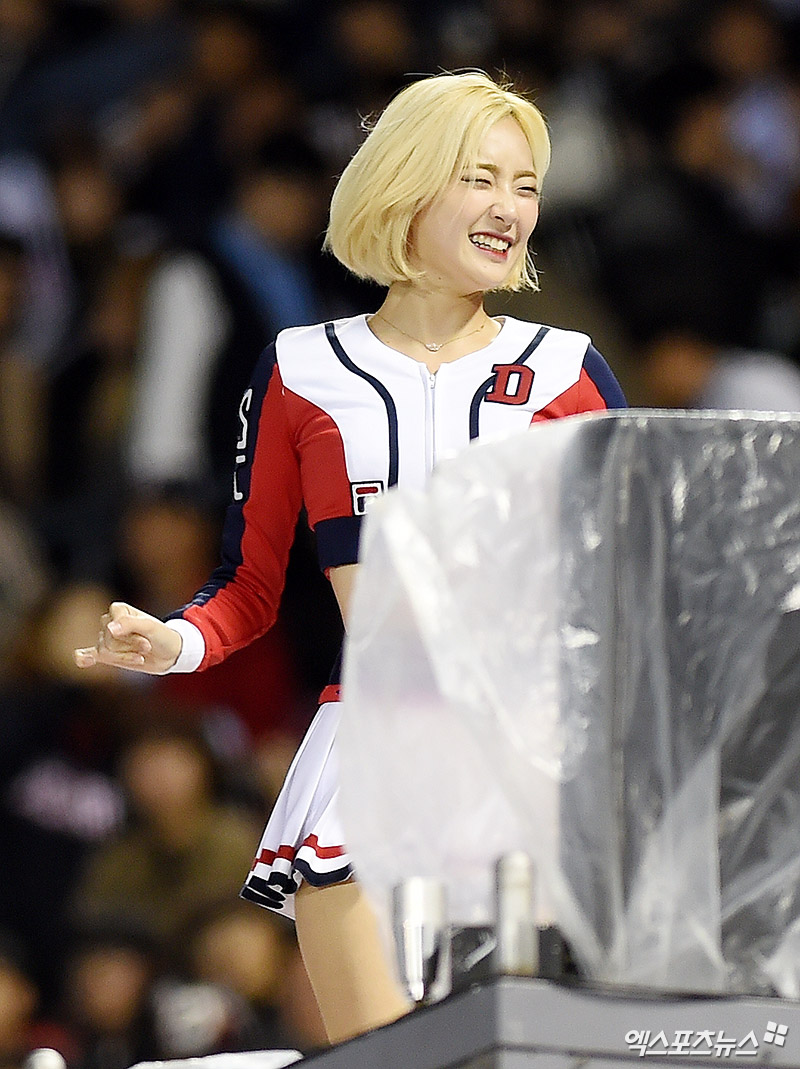 [엑스포츠뉴스 박지영 기자] 18일 오후 서울 송파구 잠실야구장에서 열린 '2017 타이어뱅크 포스트시즌' NC 다이노스와 두산 베어스의 플레이오프 2차전 경기, 두산 치어리더가 멋진 공연을 선보이고 있다.