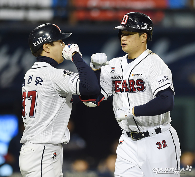 [엑스포츠뉴스 박지영 기자] 18일 오후 서울 송파구 잠실야구장에서 열린 '2017 타이어뱅크 포스트시즌' NC 다이노스와 두산 베어스의 플레이오프 2차전 경기, 6회말 2사 1, 2루 두산 김재환이 3점 홈런을 때려낸 뒤 홈에서 박건우와 기쁨을 나누고 있다.