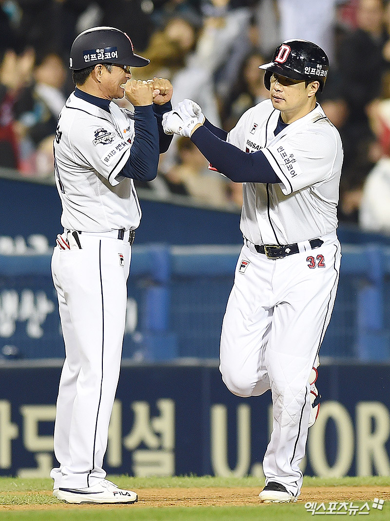 [엑스포츠뉴스 박지영 기자] 18일 오후 서울 송파구 잠실야구장에서 열린 '2017 타이어뱅크 포스트시즌' NC 다이노스와 두산 베어스의 플레이오프 2차전 경기, 6회말 2사 1,2루 두산 김재환이 3점 홈런을 때려낸 뒤 베이스를 돌고 있다.