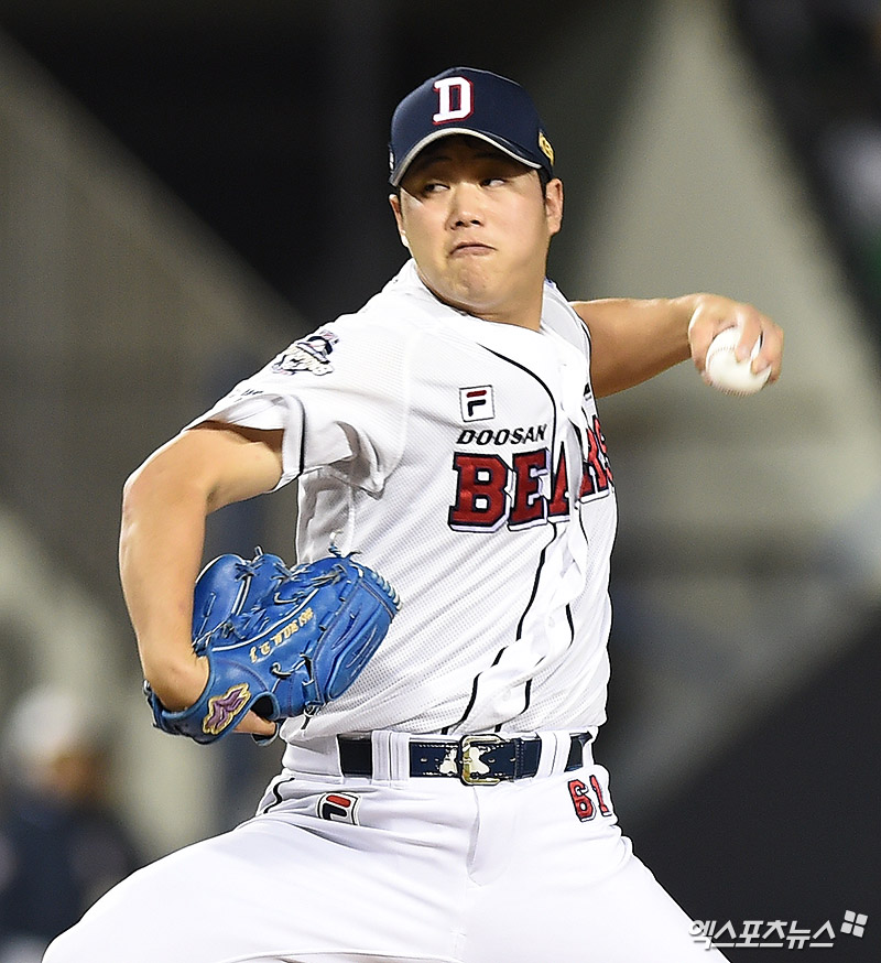 [엑스포츠뉴스 박지영 기자] 18일 오후 서울 송파구 잠실야구장에서 열린 '2017 타이어뱅크 포스트시즌' NC 다이노스와 두산 베어스의 플레이오프 2차전 경기, 7회초 2사 1루 두산 함덕주가 역투하고 있다.
