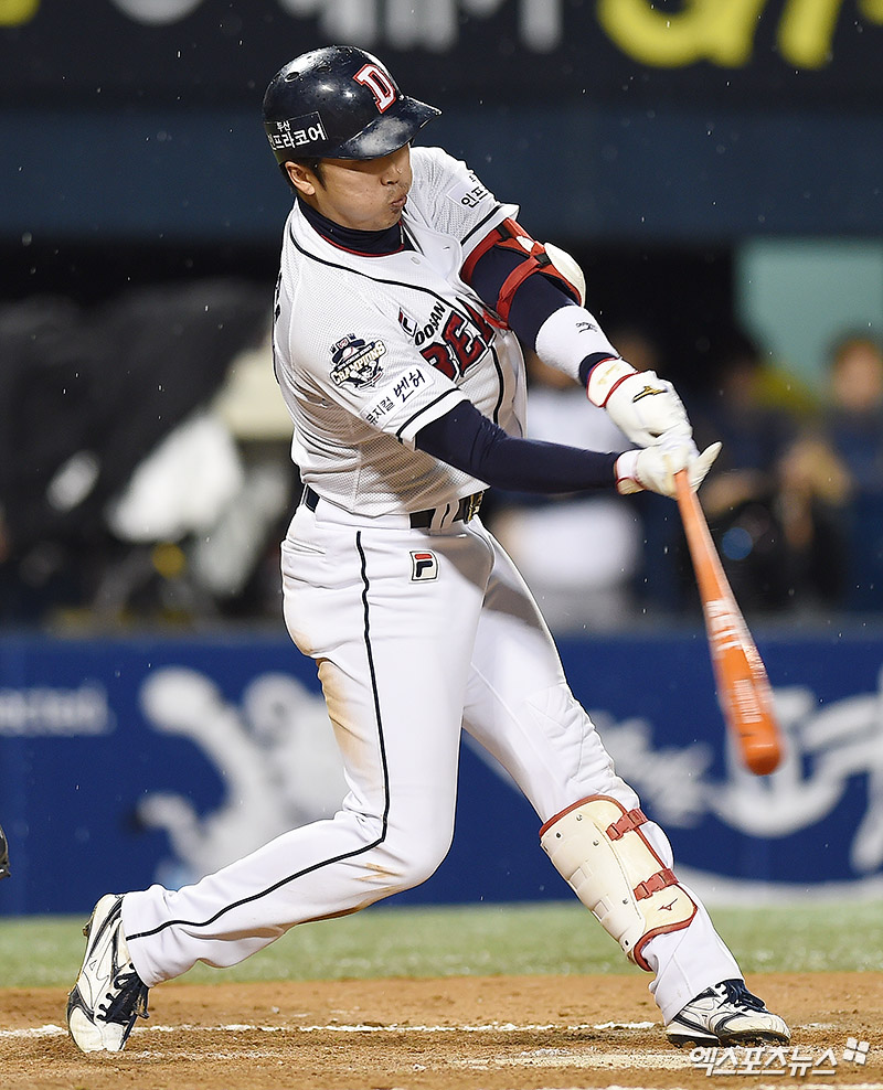 [엑스포츠뉴스 박지영 기자] 18일 오후 서울 송파구 잠실야구장에서 열린 '2017 타이어뱅크 포스트시즌' NC 다이노스와 두산 베어스의 플레이오프 2차전 경기, 7회말 1사 3루 두산 허경민이 적시 2루타를 때려내고 있다.