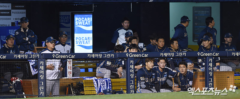 [엑스포츠뉴스 박지영 기자] 18일 오후 서울 송파구 잠실야구장에서 열린 '2017 타이어뱅크 포스트시즌' NC 다이노스와 두산 베어스의 플레이오프 2차전 경기, 7회말 NC 선수단이 더그아웃에서 경기를 지켜보고 있다.